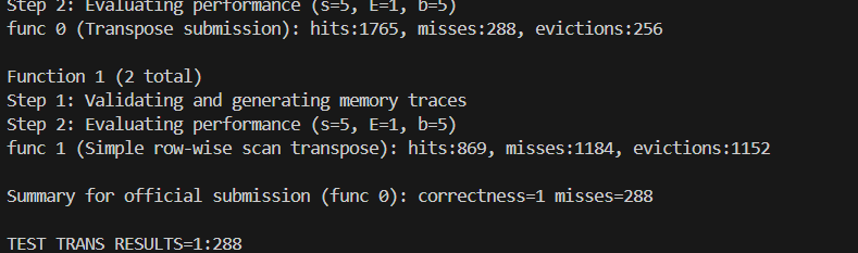 size values (e.g., 16, 17, 18, 20), it was found that a block size of 17 yielded the best performance for this specific cache and matrix shape. - Final Result: 1992 misses (comfortably meets the requirement of <2000). Final Results and Validation